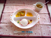 きりん組(2才児)が普通食を食べていますが、一人ひとりに見合った給食を調理員さんが作っています。 |
