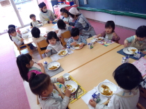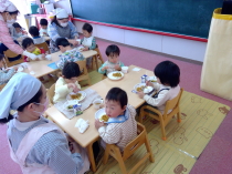 大きい子、小さい子、みんな一緒に給食を食べたよ |