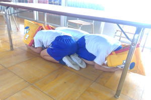 防災頭巾を被って避難したよ! |