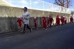 「1、2、1、2・・・」みんなでかけ声を掛けながら保育所周辺や園庭を走りました!
